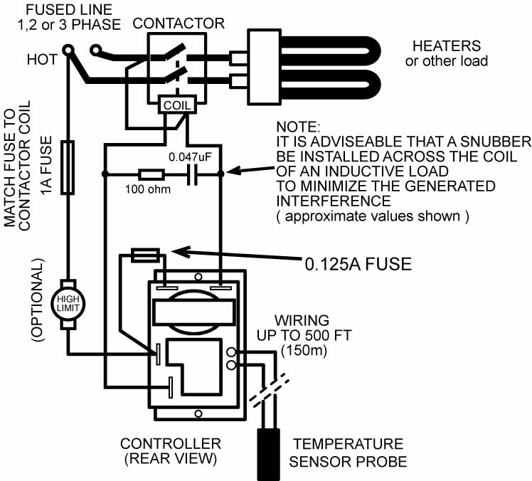 The thermostat controls one on-board relay with contacts rated for up to 30Amp, 250Vac load max. Optionally an internal alarm buzzer or a low power relay can be ordered for special applications to control loads of up to 1Amp, 250Vac max. for instance to activate other external devices.